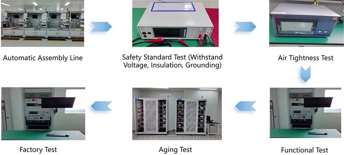 Продуктът е преминал CE сертификация на ЕС, FCC сертификация на САЩ, CCC сертификация на Китай и CB сертификация, в съответствие със стандартите за безопасност IEC 62368-1 и екологичните изисквания на RoHS, с пълен контрол на качеството на процеса от суровините до готовите продукти. Фабриката разполага със стандартизирани производствени линии и професионални лаборатории за изпитване. Всеки продукт се подлага на 72-часов непрекъснат тест за стареене, тест за устойчивост на напрежение, тест на околната среда при висока и ниска температура, преди да напусне фабриката, за да се гарантира стабилна работа. Осигуряване на сертификати за квалификация на продукта и протоколи от тестове, подпомагащи фабрична инспекция на място и вземане на проби за качествен контрол от клиенти.