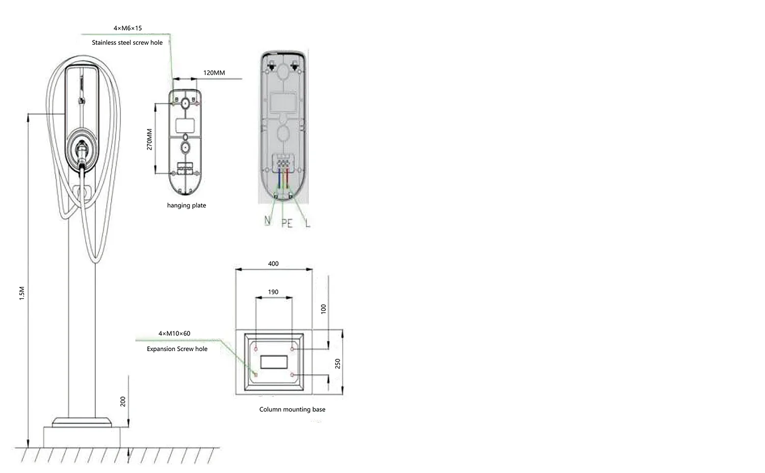 1) Бетонната основа за зареждащата купчина трябва да има якост C25. Подземната част е 400мм, а надземната 200мм. Размерите на бетона са 400*250 мм. Основата трябва да има заровена изходяща тръба в центъра и 4 разширителни болта M10*60 трябва да бъдат фиксирани върху основата.